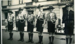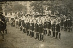 The scouts prepare for a parade outside the Boys' Club, where we continue to meet. Circa early 1960s. Courtesy of Mike Cannon.