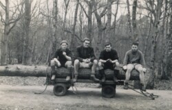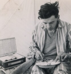 The Hargreaves work party taking a deserved break in their accommodation, a Nissen hut on the far side of the site. Courtesy of Eifion Harris.