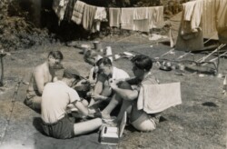 Whilst sitting on the floor listening to the radio, the boys prepare dinner. Courtesy of Eifion Harris.
