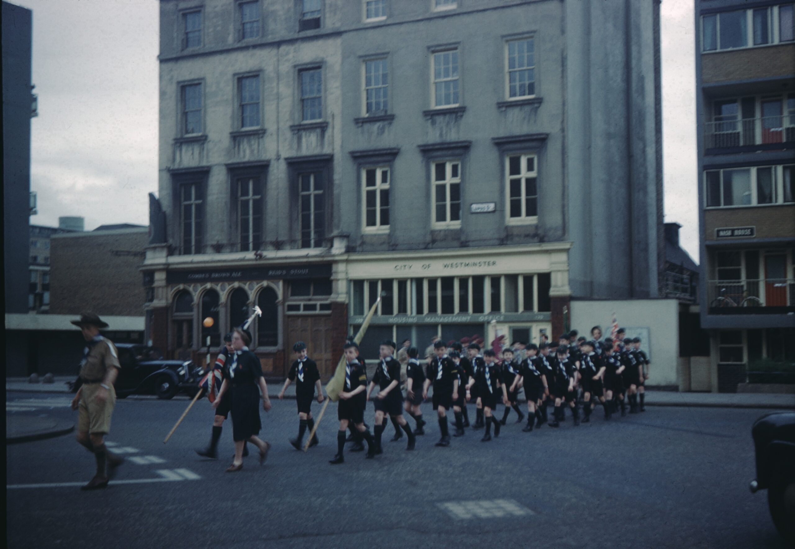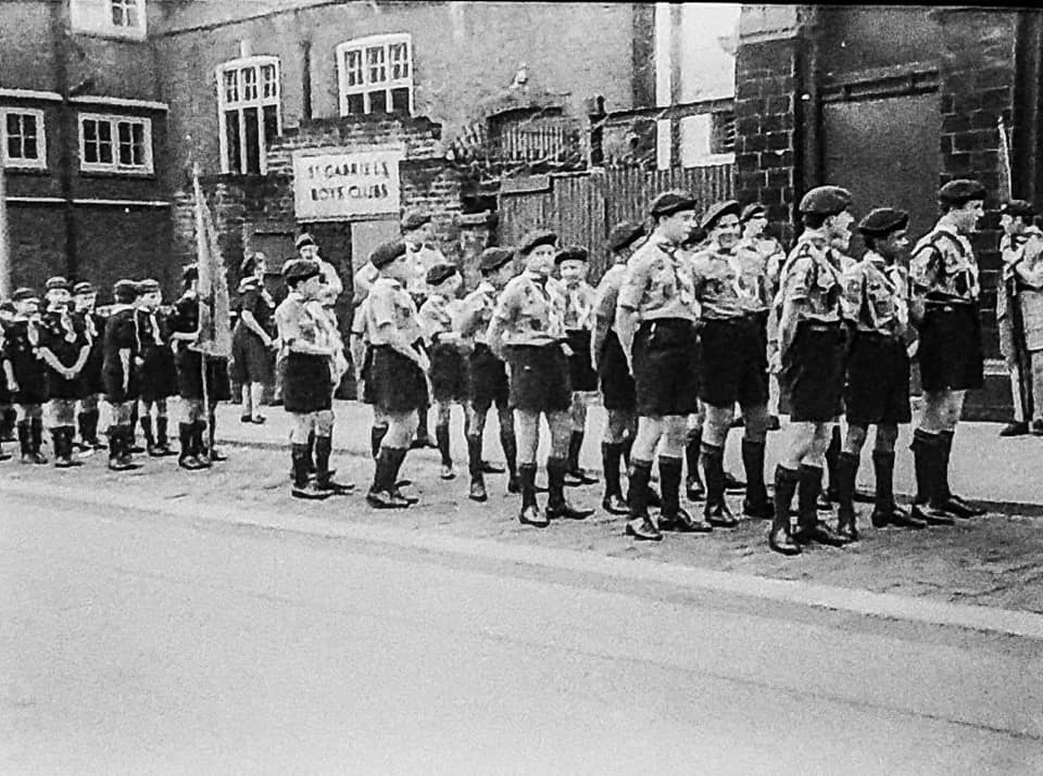 The scouts prepare for a parade outside the Boys' Club, where we continue to meet. Circa early 1960s. Courtesy of Mike Cannon.