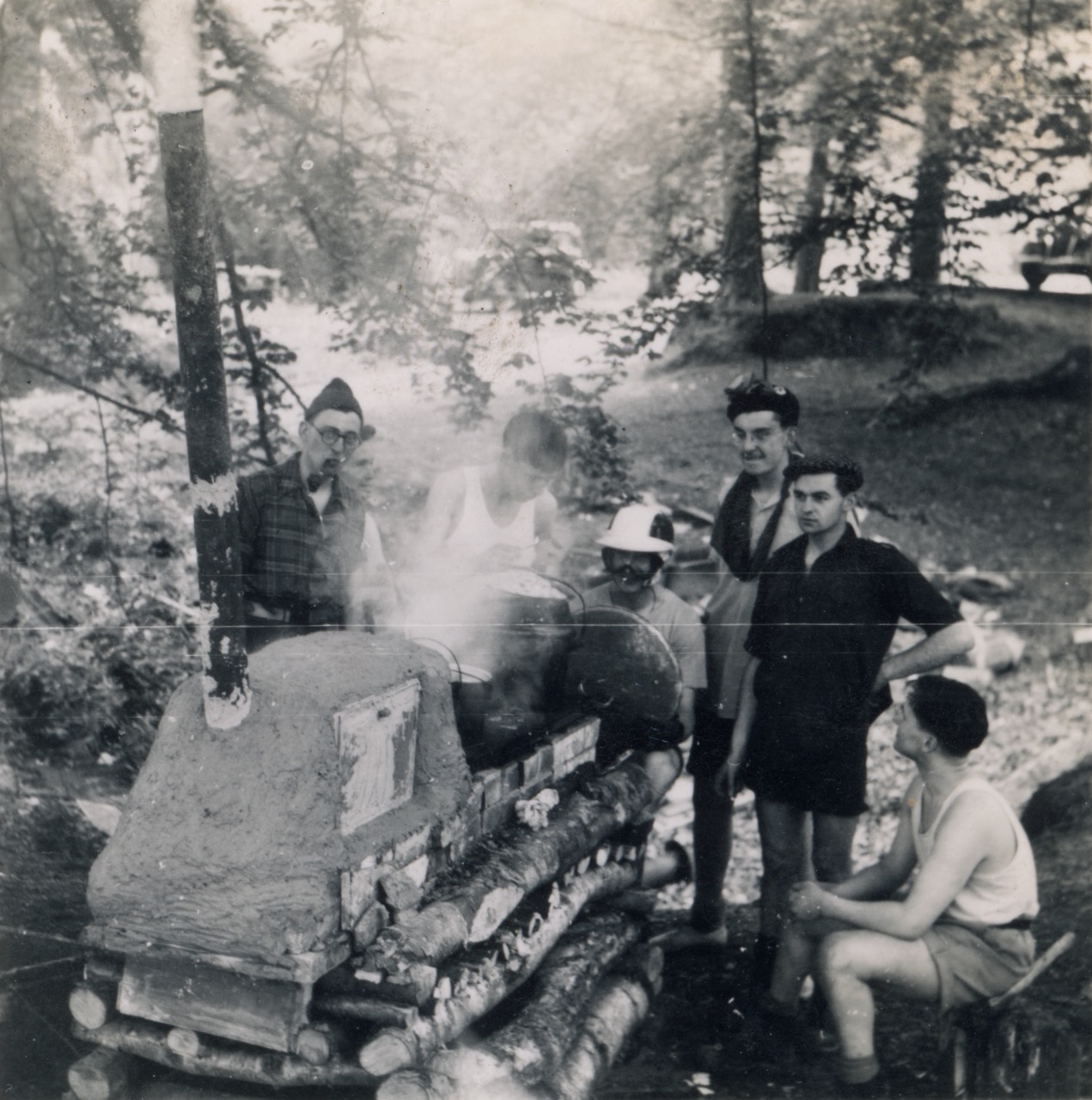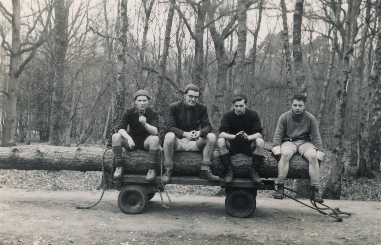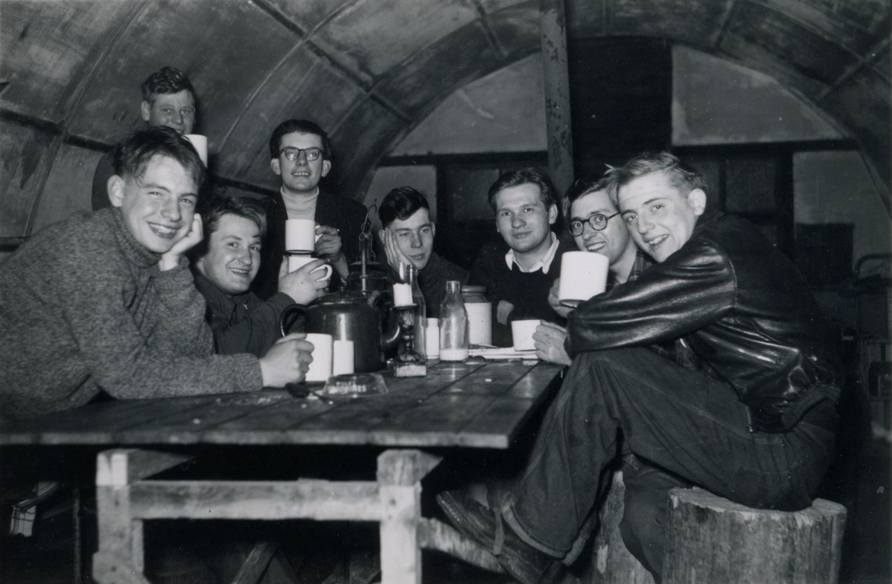 The Hargreaves work party taking a deserved break in their accommodation, a Nissen hut on the far side of the site. Courtesy of Eifion Harris.